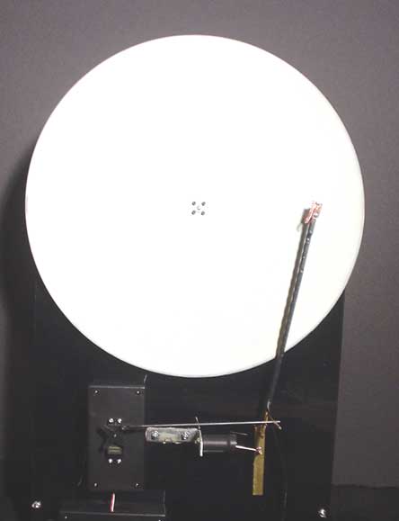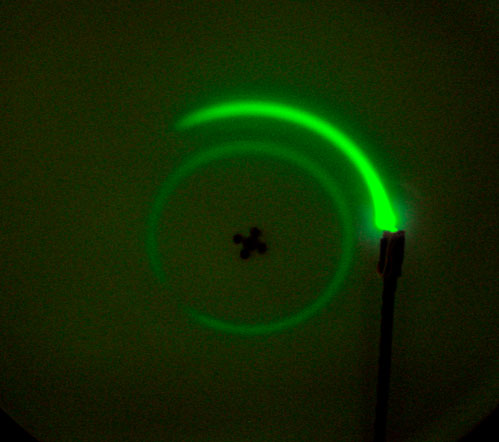 The platter is hand-painted with a phosphorescent pigment. The stylus is a near-ultraviolet LED, controlled by a servo motor.